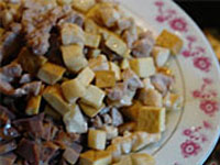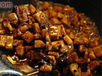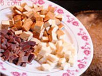 锅中再倒油少许,放入鸡肉,猪肉,鸭肫,豆干,冬笋炒至7-8成熟捞出备用。