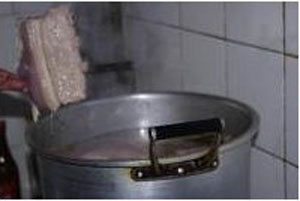 将炸好的猪五花条肉肉皮朝里放入蒸碗里,放入烧开的蒸锅里用中火蒸1小时,蒸至肉酥。