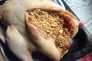 3)肚子处理干净后,把拌匀的糯米馅料填进鸭肚子,不要塞太满,煮后糯米会膨胀,也不要压太紧,那样不容易熟