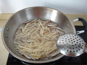 3)把水烧滚后,将干丝倒进去烫一烫,等冷却到30~50度时,把水滗干。这样反复3次,可以去豆腥味。