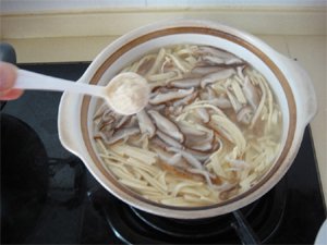 5)倒入干丝、鸡汤和泡过的开洋水或黄酒,汤的量以正好盖没干丝