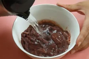 3)切好的猪肝块放入清水中泡出血水(中间可以换水2-3次)挤干多余的水分