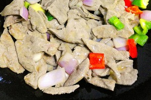 4)猪肝腌制,加一点点盐,白胡椒粉,生抽,老抽,酒,抓均匀,加半个蛋清,干淀粉,腌制10分钟