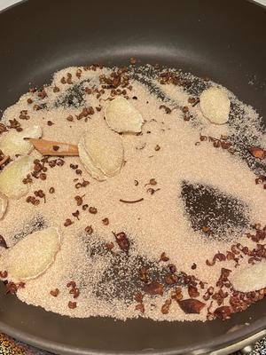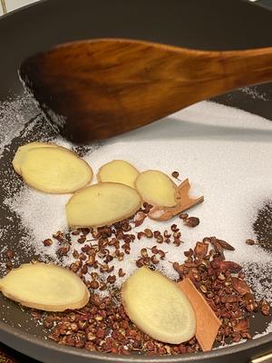 2)150克盐,加盐,花椒,八角,桂皮,姜一起炒,炒到颜色发黄