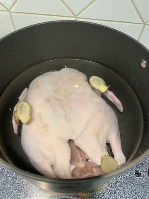 5)把鸭子内外的调料冲干净,这样煮出来的鸭子色泽才白嫩. 冷水入锅,把鸭子完全没入水中,可压一小碟子。 水中放入四片姜,一根葱,一片香叶,一颗丁香,煮开后,把浮沫撇干净,盖盖保持似滚非滚的状态再煮30分钟。 这个也看自家火力火候以及个人喜好可以适当延长。煮时水一定要没过鸭子保持似滚非滚。