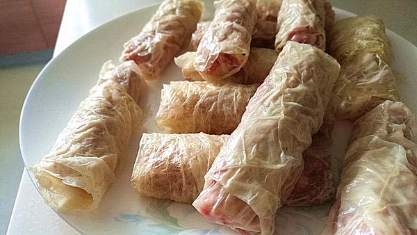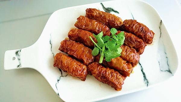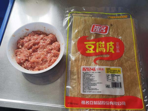 1) 肉末里面加少量盐和糖,少许料酒,少许白胡椒粉,拌匀。 豆腐衣稍微用热蒸汽烘一下,软化后,放入适量肉末,像包春卷一样包裹起来