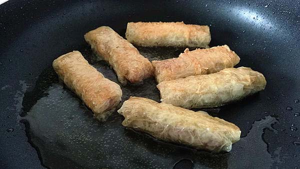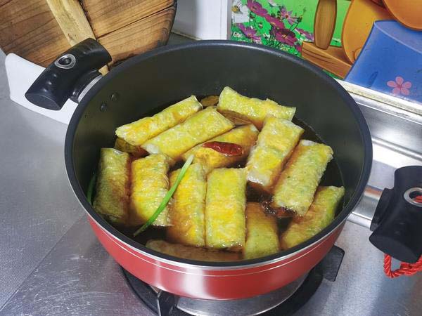 2) 放入锅中,两面煎至金黄,捞出锅中加水稍微没过豆腐衣卷