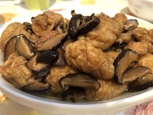 1.香菇、干面筋分别浸泡水至软,并挤干水份,香菇切丝备用。