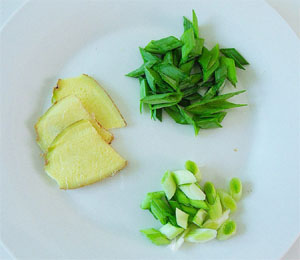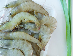 锅中留适量虾油,把姜片和葱白放入爆香。把炒好的虾放入翻炒。