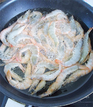 锅中放适量油,把虾放入,炒至虾壳跟肉有点分离,外壳很酥脆即可;