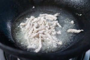 4) 坐锅热油,放肉丝煸炒